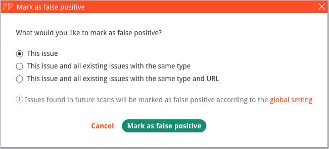 When marking an issue as false positive, you can choose whether this applies only to this issue, or to other issues of the same type or URL: